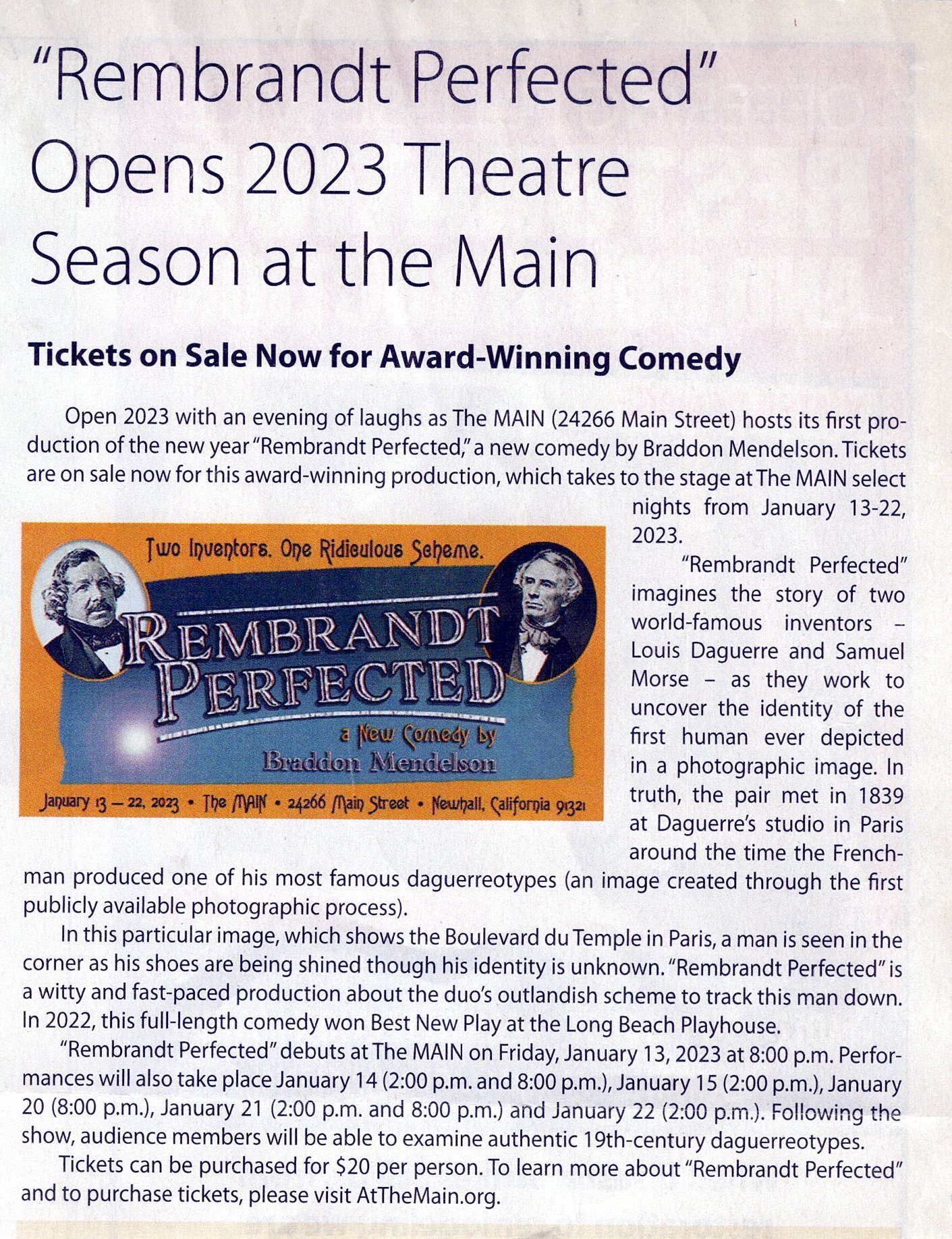 Press Releases Genesis of a Playwright Looking for local theatre in Los Angeles? Check out "Rembrandt Perfected" at The MAIN in Newhall. In the News TheTVolution SCV Signal Calendar SCV Signal Calendar Listings SCV Signal Newspaper Google Search Calendar All Events City of Santa Clarita Press Releases 23 Aug 2022 20 Nov 2022 Print